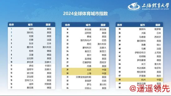 上海体育大学发布了《2024全球体育城市指数》,纽约、洛杉矶、伦敦、巴黎、东京位居全球体育城市综合排名前五;中国有三个城市跻身全球50强。