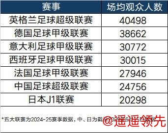 欧洲五大联赛以及中、日职业联赛的场均上座率。