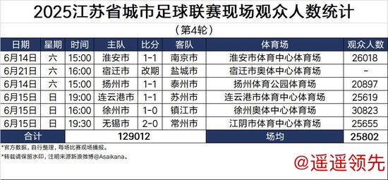 根据权威数据媒体《德国转会市场》中国区管理员朱艺的最新统计数据,“苏超”第4轮观众人数再创新高,5场比赛(不含一场6月21日比赛)场均观战人数25802人,甚至超过了本赛季中超场均观众人数(24756)。