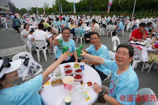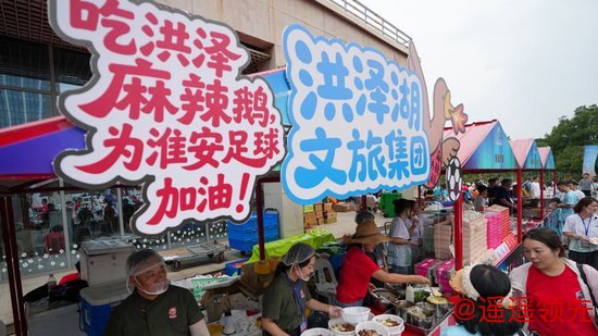 新华社照片,淮安(江苏),2025年6月14日 6月14日,球迷在江苏淮安“苏超”市集品尝美食特产。 当日,江苏省淮安市以“激情夏日 乐享足球”为主题,在江苏省城市足球联赛第四轮淮安队对阵南京队比赛期间,在淮安奥体中心周边打造集美食体验、购物休闲、娱乐互动、文化传播为一体的淮安主场比赛配套市集,营造热烈的赛事氛围,提升赛事附加值。 新华社记者 李博 摄