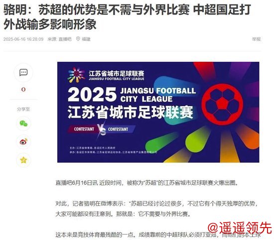 《体坛周报》记者骆明在微博表示:“苏超已经讨论过很多,不过它有个得天独厚的优势,大家可能都没有注意到。那就是:它不需要与外界比赛。